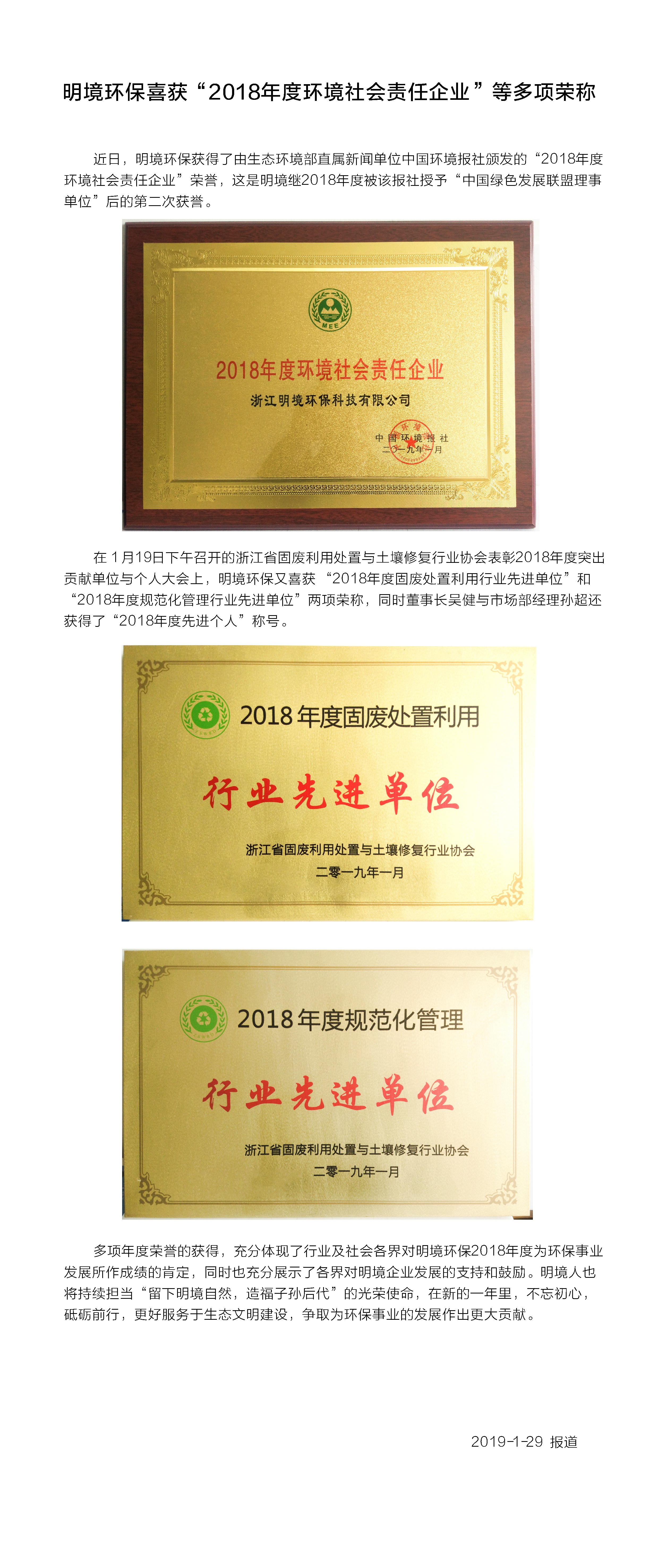 明境環(huán)保喜獲“2018年度環(huán)境社會責任企業(yè)”等多項榮稱
