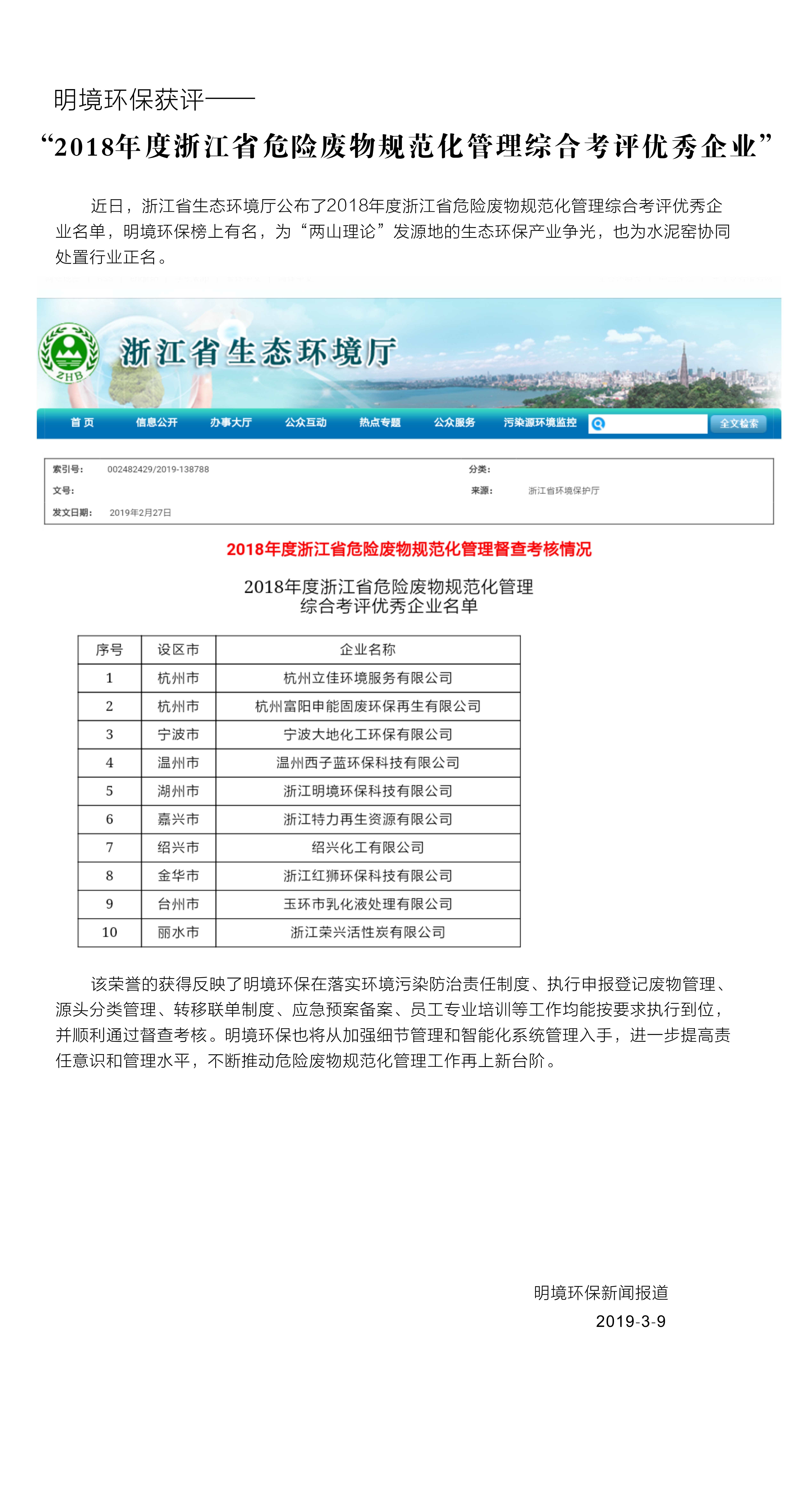 明境環保獲評“2018年度浙江省危險廢物規范化管理綜合考評優秀企業”